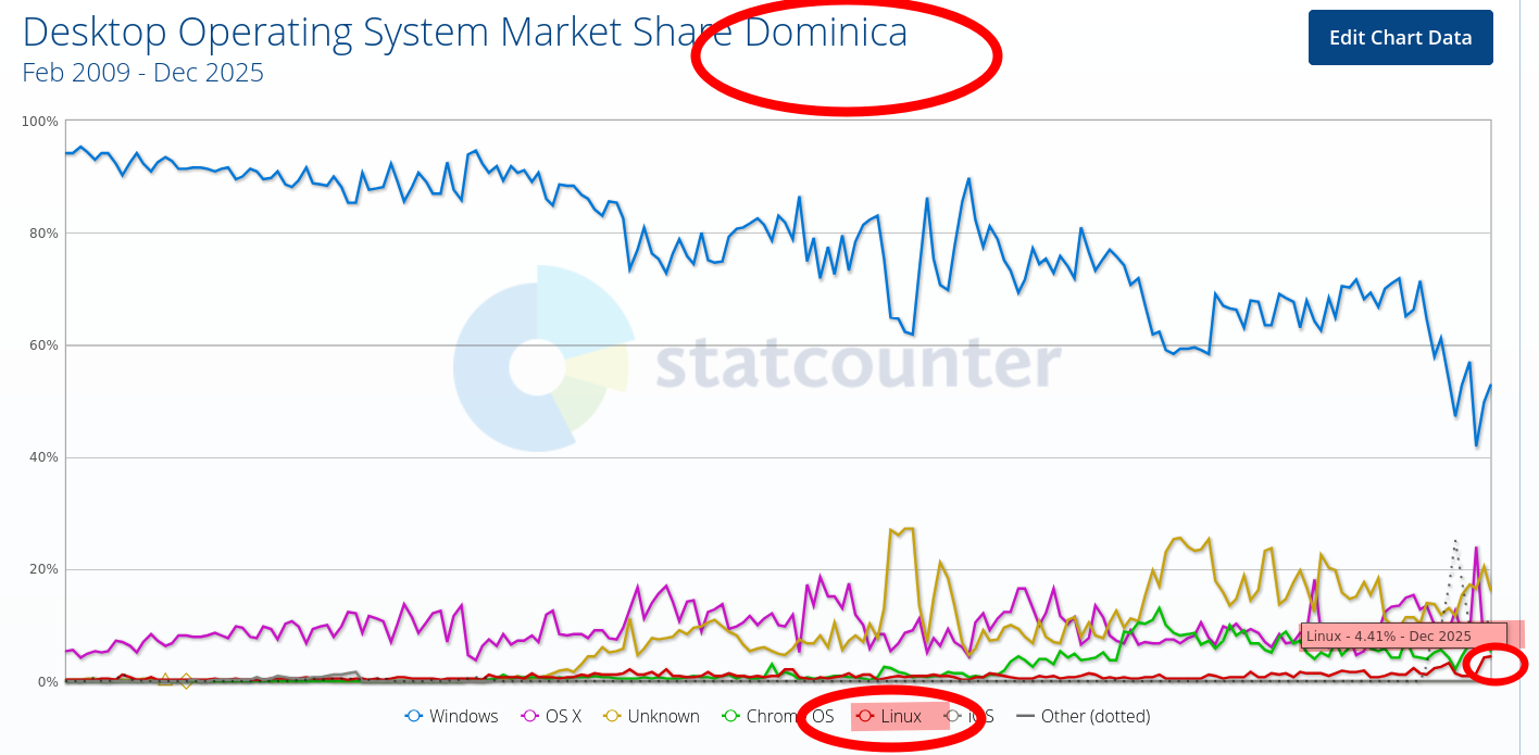 When we wrote about Dominica last year we saw GNU/Linux "proper" at around 2%. Now it's close to 5%, based on "end of year" (2025) data from statCounter. It's not a large country, there are fewer than 100,00 inhabitants in it, but the trends matter. █
