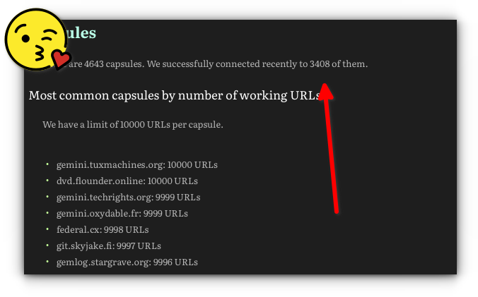 4 days ago we said that Geminispace had grown to the point of having nearly 3,400 active capsules known to Lupa and days later it's at almost 3,410.