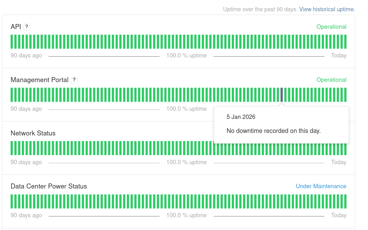 Last year we experienced one incident upstream, which resulted in the network being unavailable for a number of minutes. It has been over 90 days since that incident, so now we're back to all green: