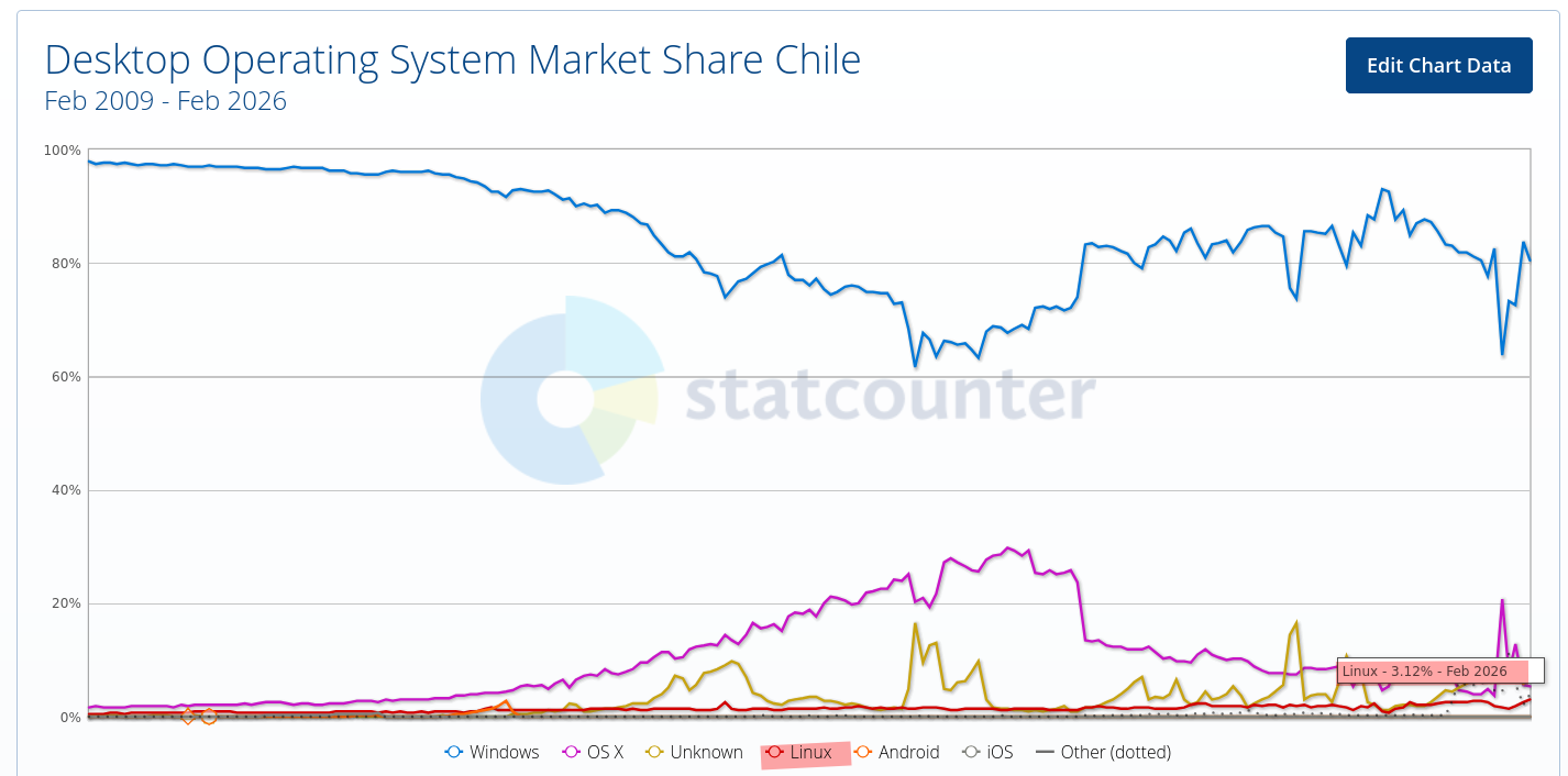 At the end of last year we examined the situation in Chile based on Web statistics [1, 2] and this month we see an all-time high for GNU/Linux over there: