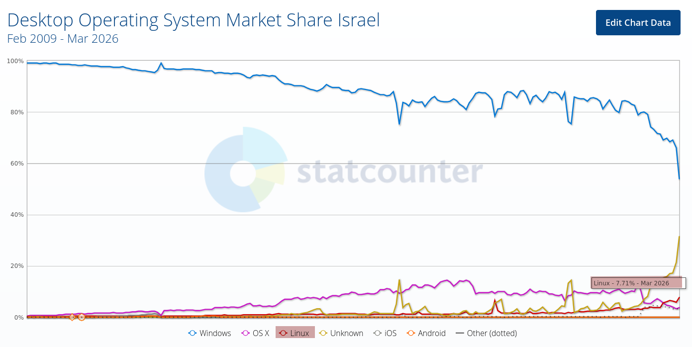 The way statCounter sees it based on data requests from Israel, GNU/Linux doubled in the past 6 months and Microsoft is in a freefall amid closures and mass layoffs.